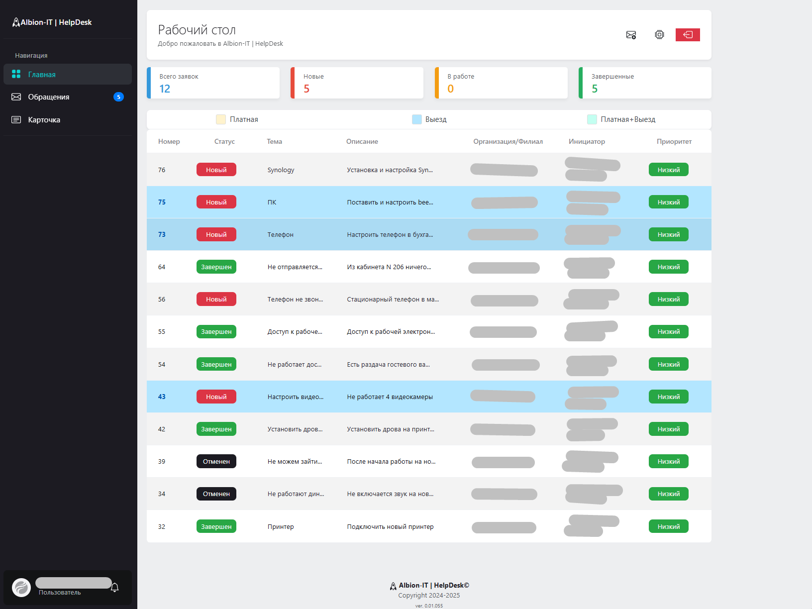 Главная страница на стороне пользователя является основным информативным полем по обращениям, их созданию и отслеживанию.