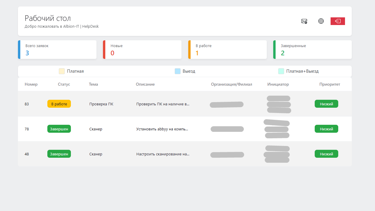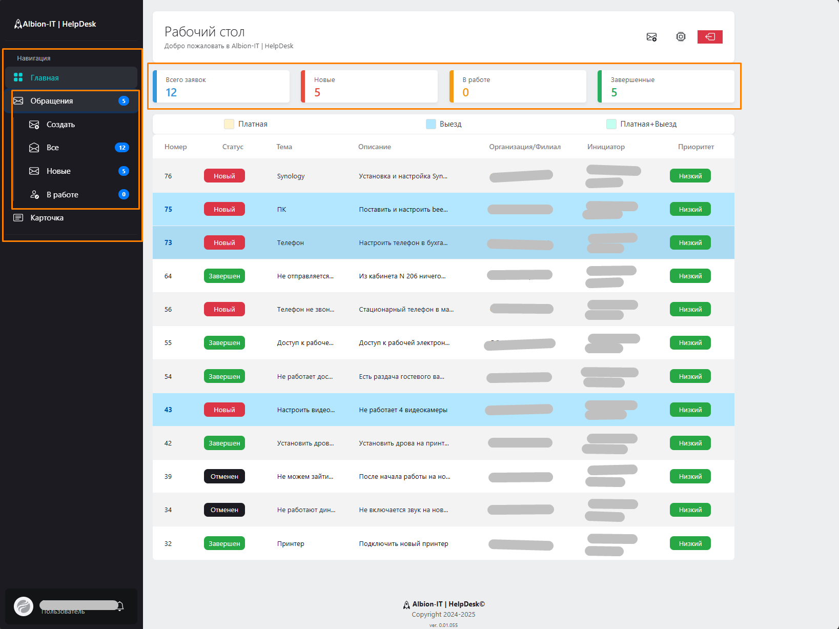 Также для удобства предусмотрены фильтры, где по нажатию на плитки "Всего заявок", "Новые", "В работе", "Завершенные" мы переходим на страницу с фильтрацией данных обращений. Статусы и фильтрация обращений доступна и в боковом меню,
